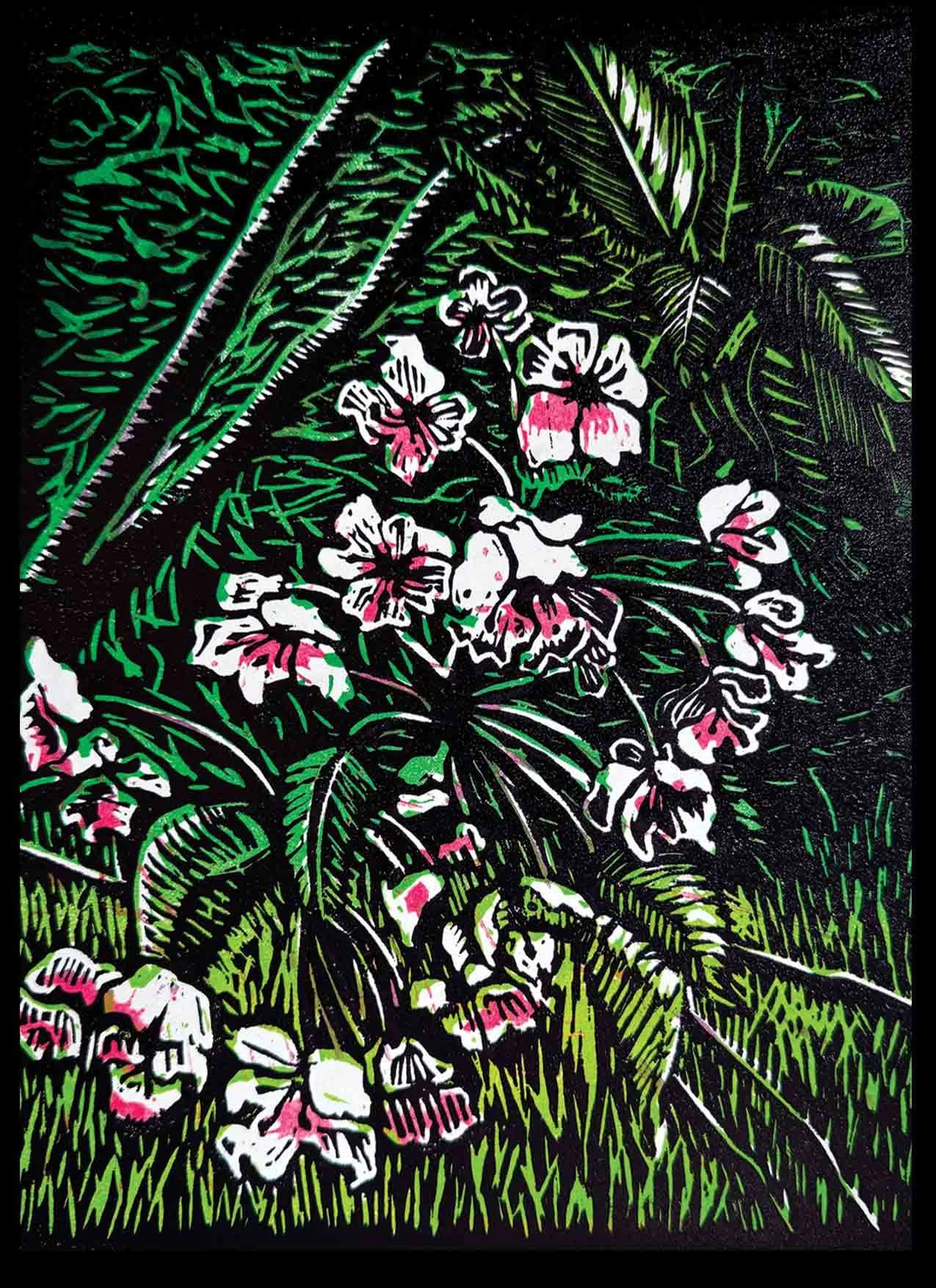 ‘Cherry Blossom Song ’ has been finished as a multi-plate linocut, adding colors & a blended roll background.