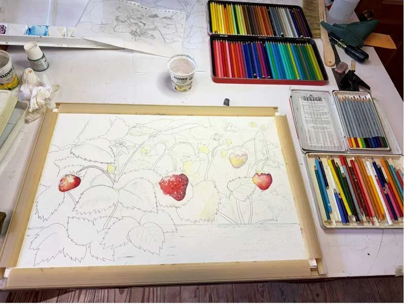 The strawberries continue to give fruit from August until October, inspiring a new watercolor. The challenge is protecting the fruit from slugs & birds. The trick is to pick them in the early evening, after having a full day of sun, before the march of the slugs.